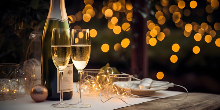 Luxury holiday composition, a bottle of chilled champagne and glasses on the table in front of the seated people, festive lights in the background