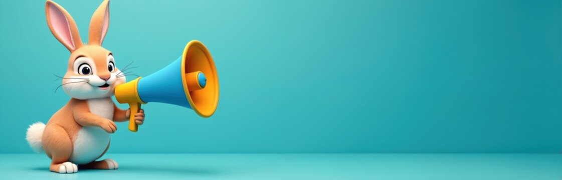 Cute bunny rabbit holds a large megaphone banner against a vibrant blue background. The illustration suggests an announcement or promotion with energetic expression.