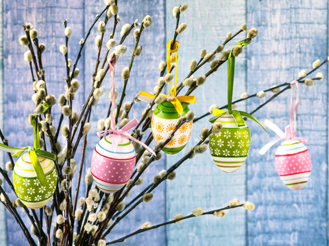 Colorful Easter eggs on willow twigs. Easter tree with festive ribbons on a blue background. Happy Easter concept
