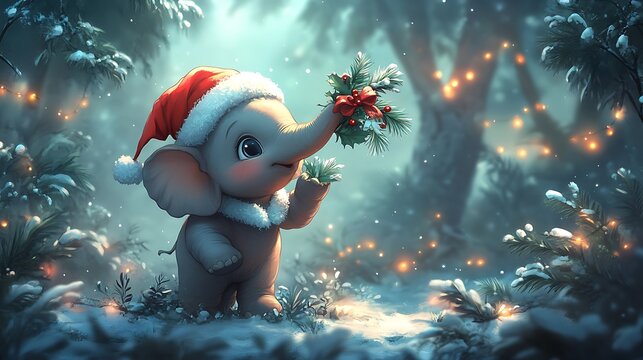 A cute baby elephant wearing a Santa hat enjoys the festive Christmas atmosphere.