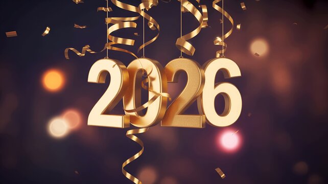 Celebrate a brilliant 2026 with sparkling gold ribbons and confetti, perfect for new year wishes, invitations, and festive announcements