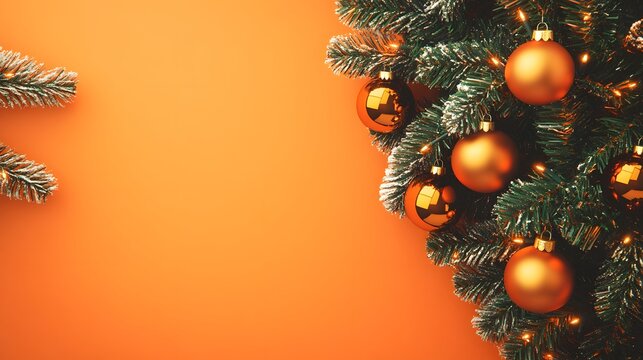 Festive Orange Christmas Background with Tree Branches and Ornaments