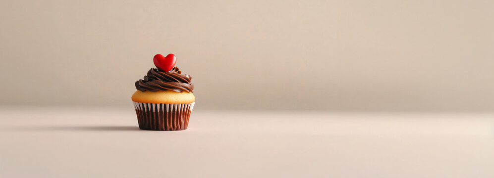 Chocolate cupcake muffin with a red heart on mocha mousse on beige background. Banner template for love, sweets, poster, and cards for party, birthday and Valentine's day with place for text.