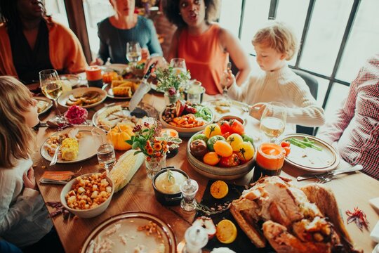 A diverse group enjoying a festive meal. Family gathering with food, laughter, and conversation. Festive meal with diverse group sharing food and joy. Celebrations and family gathering.