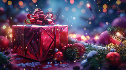 Holiday Cheer: A radiant individual, adorned in festive attire, presents a neatly wrapped gift, embodying the spirit of celebration and generosity amidst a vibrant holiday backdrop.