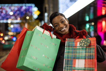 Portrait happy young woman Christmas shopping in city at night
