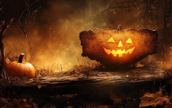 Halloween pumpkin with spooky lighting and text overlay