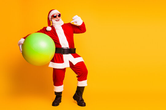 Santa in red costume holding large green ball smiles against yellow background festive cheerful Christmas holiday promotion and family themed imagery