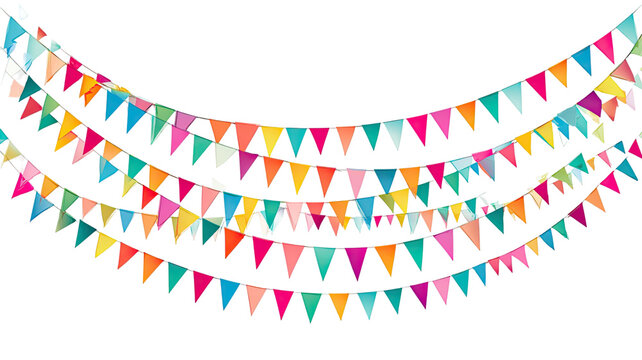 Colorful triangular bunting flags strung together, creating cheerful party decor with transparent background, ideal for festive design projects