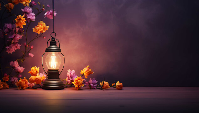 Couple of glowing Moroccan ornamental lanterns on the table. Greeting card, invitation for Muslim holy month Ramadan Kareem. Festive blue night background with glittering golden bokeh lights