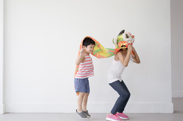 Human in easter bunny costume mascot of Easter entertaining kids on Easter festival outdoors