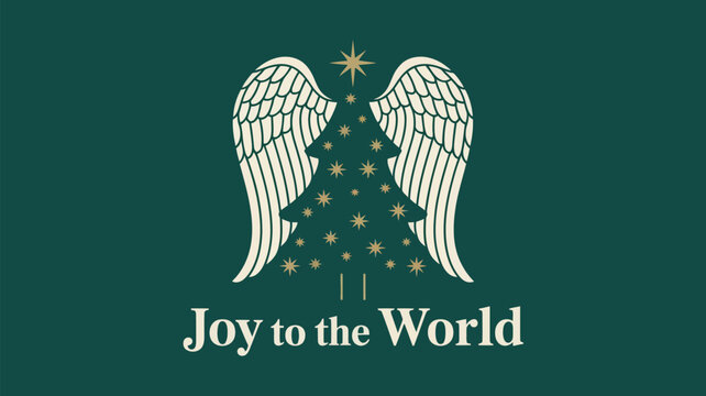 Elegant Christmas tree with angelic wings and star, proclaiming "Joy to the World" for festive holiday designs