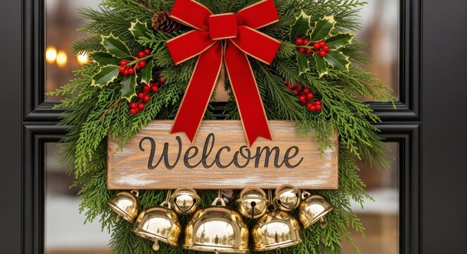 Holiday Welcome: A festive wreath with a welcoming message adorns a front door. A delightful display of seasonal cheer.