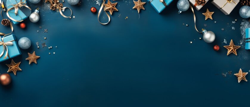 Christmas and new year greeting card with ornaments and gift on blue background with copy space