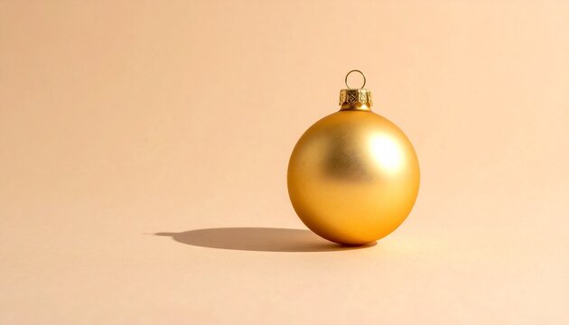 A single golden Christmas bauble casting a long shadow on a plain beige background, symbolizing festive holiday decoration