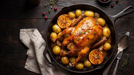 A festive roasted duck with golden potatoes, grilled oranges, and cranberries sits in a cast iron skillet on a dark rustic wooden table with vintage cutlery.