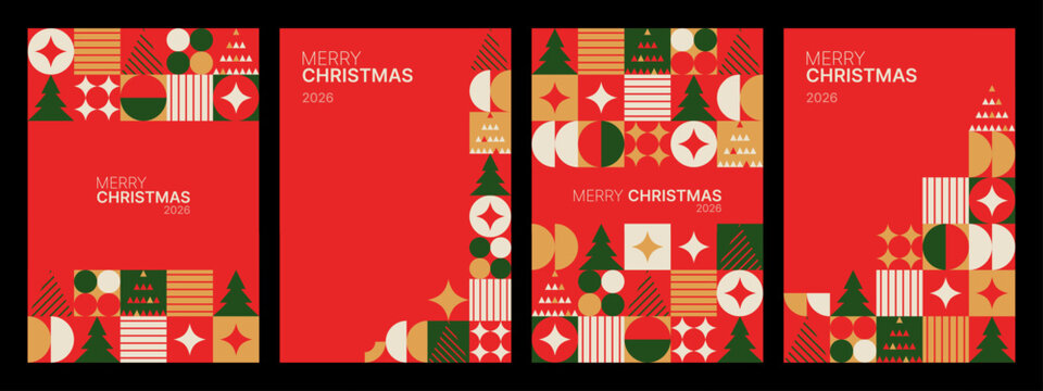 Geometric Christmas mosaic greeting cards. Merry Christmas and New Year modern abstract mosaic icons. Christmas tree, Christmas ornament and gift box. Vector illustration set.