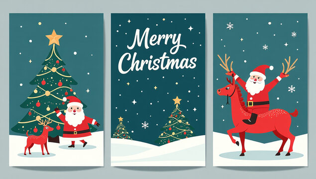 Christmas cards in modern minimalist geometric style. Colorful illustration in flat cartoon style. Xmas backgrounds with geometrical patterns, stars and abstract elements