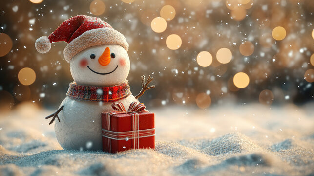 funny cheerful Christmas snowman wearing a hat holding a gift, holiday 3d character in playful pose isolated on christmas background bokeh with space for text, festive joyful scene
