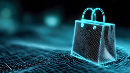 Digital shopping bag in glowing wireframe design, set against a futuristic background, representing Cyber Monday online shopping concept