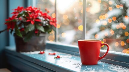 A red mug sits by a frosty window with a poinsettia plant, capturing a cozy winter morning scene with bokeh lights.