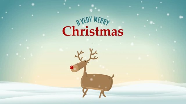 Cartoon Cute Deer with Santa in the sky on Snowy Blue Winter background with Greeting A Very Merry Christmas and Happy New Year text label card Animation