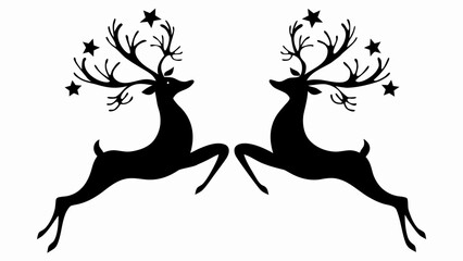 Two black reindeer silhouettes leaping with stars adorning their antlers on a white background scene