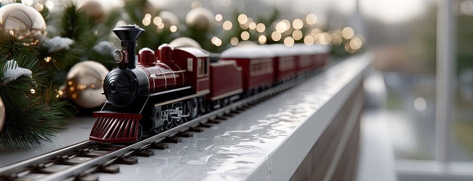 Vintage train set travels along a shiny track adorned with festive decorations during a cozy winter gathering