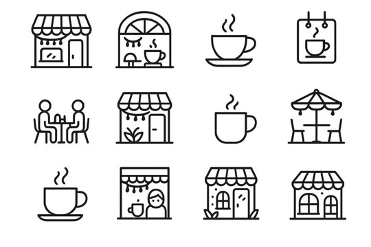 Festive Coffee Icons. Festive coffee shop. Line outline icon set of festive coffee shop: small café building,