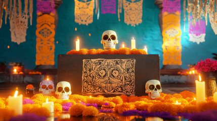 A podium with vibrant marigold garlands, flickering candles, and intricate papel picado banners, surrounded by sugar skulls for a festive Day of the Dead display.