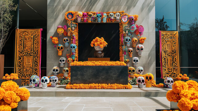 A sleek podium surrounded by papel picado banners, vibrant marigold garlands, and decorated sugar skulls for a festive Day of the Dead celebration.