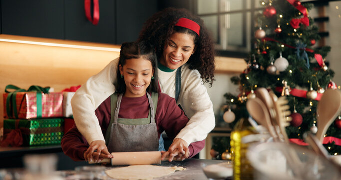Christmas, baking and rolling pin with family in kitchen of home together for festive tradition. Cooking, people or smile with daughter and single parent mother in apartment for holiday celebration