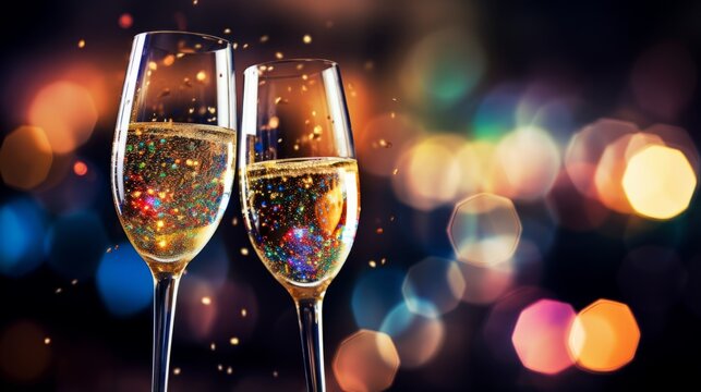 An elderly woman joyfully smiles while wearing a Santa hat and golden sunglasses as golden confetti falls around her, capturing the holiday spirit and festive cheer