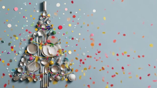 Golden cutlery and a ribbon christmas tree with ornaments on a dark background, symbolizing festive dining and holiday celebration