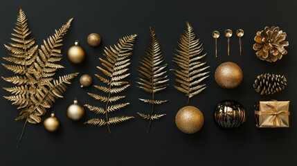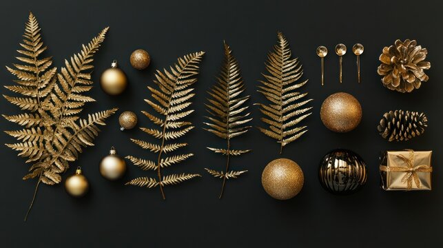 Golden glamour: festive composition of gilded elements on a dark background