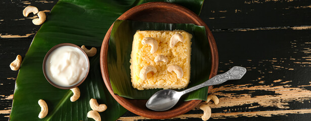 Plate with traditional Indian food pongal on dark wooden background, top view