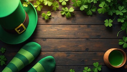 Green leprechaun hat with clover leaves scattered on a wooden surface. Striped green socks and a cup of green liquid are nearby. St Patricks Day celebration.