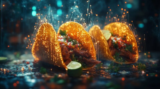 Sparkling tacos with meat and vegetables against a backdrop of festive lights: useful for advertising restaurants, culinary blogs, and holiday menus.