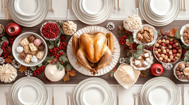A festive Thanksgiving dinner spread with a delicious turkey and a variety of mouthwatering dishes,  table setting, celebration background