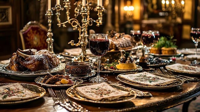 Elegant Formal Dinner Table Setting with Roasted Turkey  Wine Glass  and Silverware