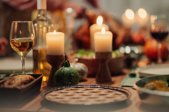 Festive thanksgiving table setting with candles, pie, and wine
