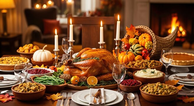 Traditional Thanksgiving Dinner Table Set with Roasted Turkey, Abundant Side Dishes, and Festive Autumn Decorations in a Warm Home Setting