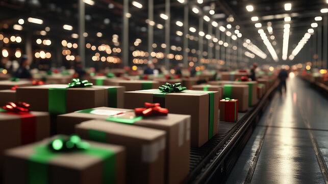 A vibrant warehouse filled with holiday packages, with green and red ribbons decorating the parcels, while employees work tirelessly to ensure every box is sorted and sent on time.
