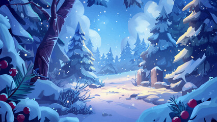 Snowy Forest Christmas Background Cartoon Illustration Winter Wonderland Festive Scene Pine Trees Snowflakes Holiday Atmosphere Cheerful Colors Whimsical Design Merry Christmas