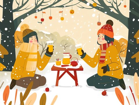 Woman enjoying warm drink in snowy winter wonderland