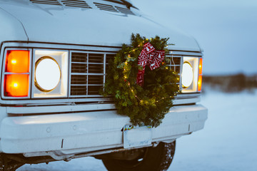 Front of vintage white van with christmas wreath