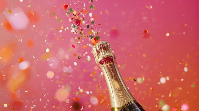 Celebratory explosion of a champagne bottle with multi-colored confetti against a vibrant pink background, sparking joyous festivities.