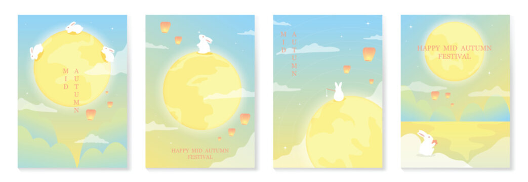 Happy mid autumn festival poster vector set. Wallpaper template with cute rabbit, moon, lantern, mountain on blue yellow gradient background. Illustration design for cover, banner, flyer, card, ads.