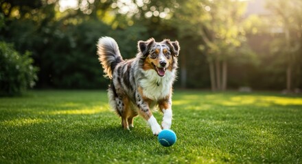 Dog fetching ball in sunny park playful environment pet joyful scene