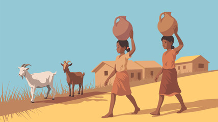 Two girls carrying water jugs on their heads walking past goats and huts under a clear blue sky